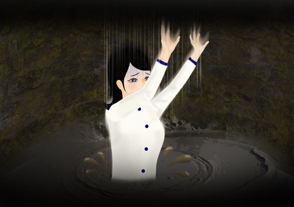 다리는 차가운 진흙 속에 빠진 채 돌벽을 양쪽 발로 힘을 주어 딛고 있었다. 그 상태로 힘들게 허리를 숙여 양동이에 흙을 퍼 담으려고 했다. 그런데 그 순간! 돌에서 발이 미끄러져 다시 진흙 속으로 빠져들다가 결국 전신이 잠겨버리고 말았다.