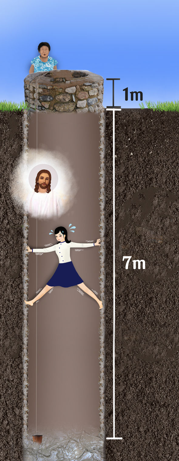 이는 오랫동안 물과 함께 흘러내린 진흙이 우물 바닥에 두껍게 쌓여 수렁처럼 된 것이었다. 나는 순식간에 배까지 잠겨 버렸다. 지하 7m 우물 속 진흙 수렁은, 캄캄한 데다가 소름이 돋을 만큼 너무 차가워 몸이 오들오들 떨려왔다. 나는 그렇다 해도 4개월 된 배 속의 아기를 생각하니 진저리가 쳐졌다. 찬 곳에 들어갔다가 아기가 잘못될까 봐 너무 걱정되었다.