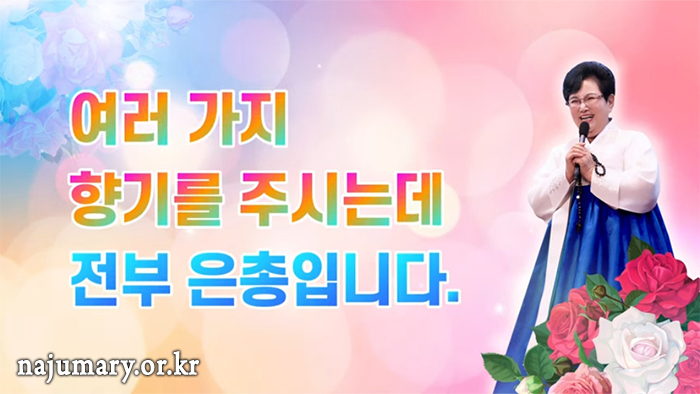 예뻐요, 안 예뻐요? (예뻐요!) 우리는 이렇게 살아야 돼요. (아멘!) “어머, 세상에 나는 왜 안 주셨을까? 왜 안 주셔요? 나 이제 안 올래!” 이러면 안 되겠잖아요. (네~) 그런데 두 분이 다 그렇게 하니까 얼마나 예뻐요. 이 장미향기는 뭐라고 그랬어요?